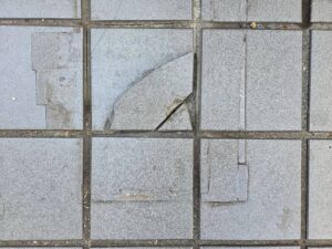 施工前、ひび割れサンダーカッター入れ既存タイル撤去タイル張り 目地入れ施工完了